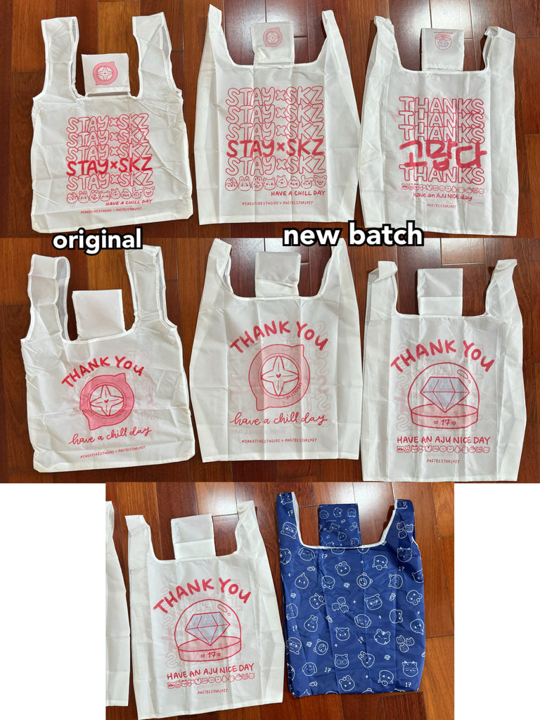 I would like to clarify that the new bags are perfectly functional, but aesthetically it gives more of a 'tote bag' visual than a 'grocery bag' visual. However, in my own standards they do not match the original batch of STAYxSKZ bags, and I designed the Seventeen version THANKS bag to be the same style, so it felt unfair for me to sell them at the same price.